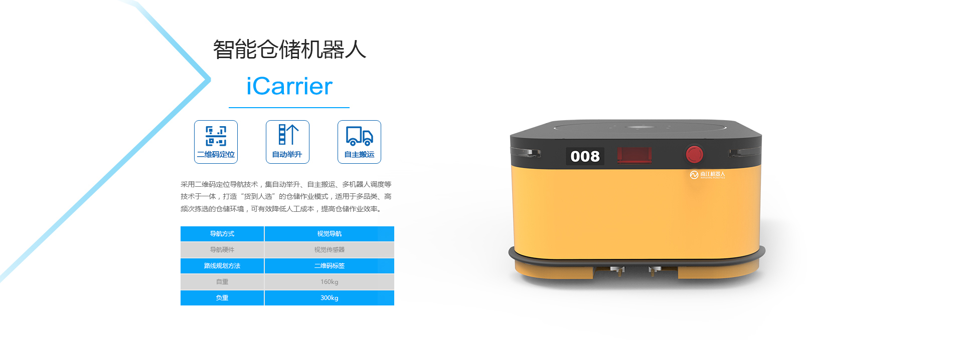 南江机器人专注于为智能制造和仓储物流领域提供智能化物流整体解决方案。基于融合自然导航、运动规划与控制、智能人机交互与认知、多机器人协同调度等核心技术,自主研发和产品化智能移动机器人、智能仓储机器人、智能服务机器人,并成功开拓了这三款智能机器人在工业、物流、商业等多个领域的市场应用,合作的客户包括华为、东芝、富士康、菜鸟等大型知名企业。