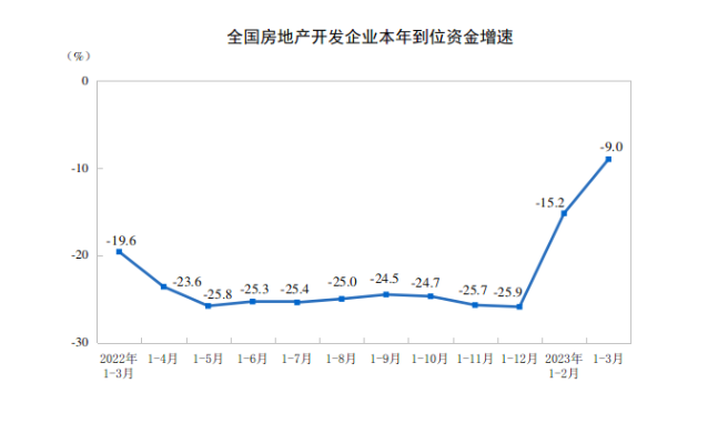 1—3月份,房地产开发企业到位资金34708亿元,同比下降9.0%。其中,国内贷款4995亿元,下降9.6%;利用外资8亿元,下降22.7%;自筹资金10171亿元,下降17.9%;定金及预收款11909亿元,下降2.8%;个人按揭贷款6188亿元,下降2.9%。