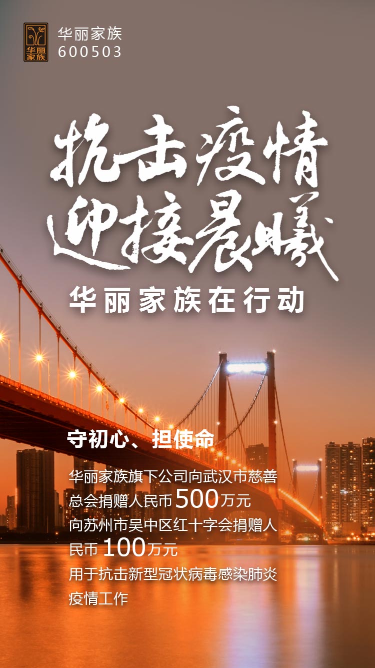 当前,受新型冠状病毒感染导致的肺炎疫情形势严峻。作为上市企业,为切实履行社会责任,华丽家族股份有限公司全资子公司苏州华丽家族置业投资有限公司向武汉市慈善总会捐赠人民币伍佰万元、向苏州市吴中区红十字会捐赠人民币壹佰万元,用于抗击新型冠状病毒感染肺炎疫情工作。
